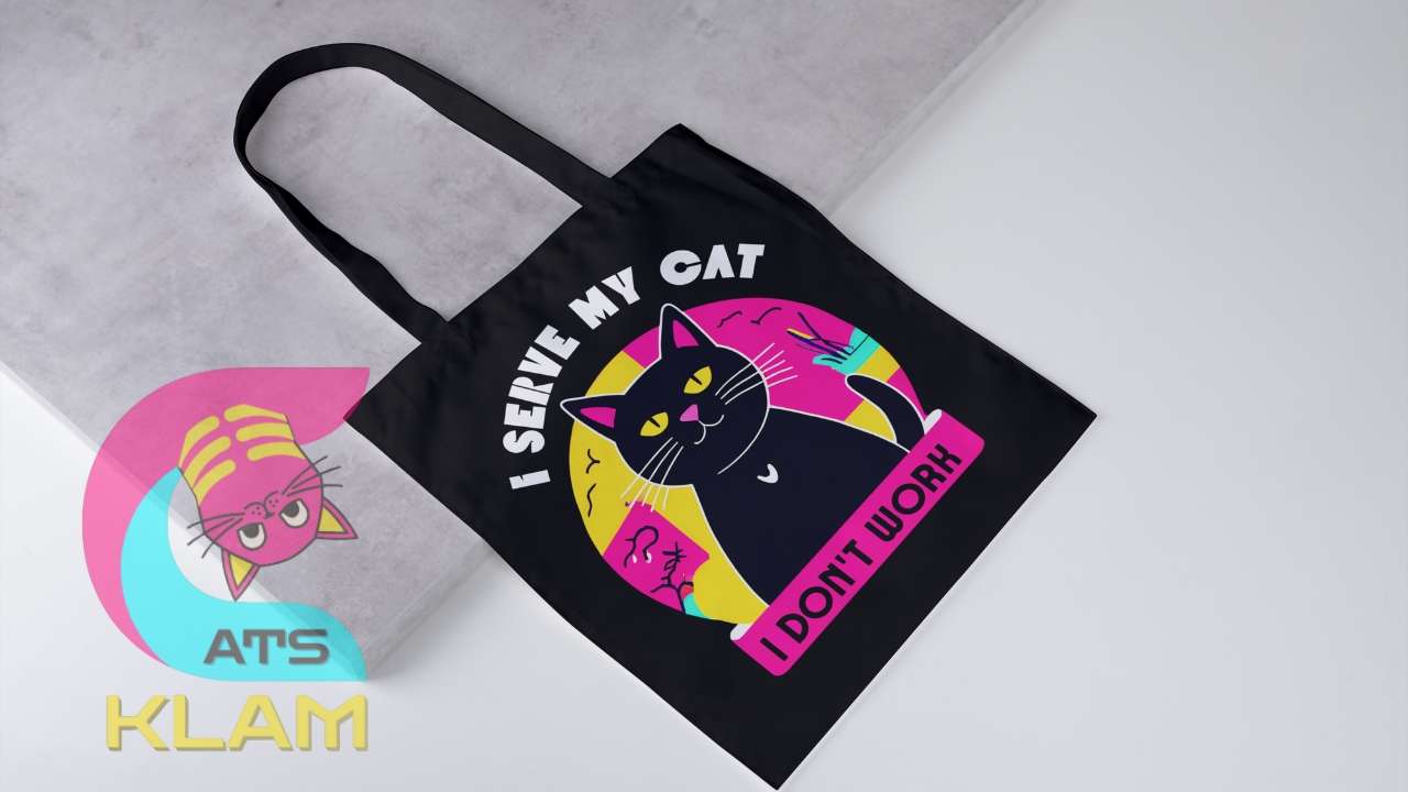 تصميم شنطة توتي باج سوداء قطة مرحة مع عبارة لطيفة I Serve My Cat توتي باج مصنوعة من خامة الدك الثقيل عالي الجودة نوع الطباعة ديجيتال Digital DTF بأحبار يابانية فائقة الجودة الشنطة بسوستة للحفاظ ع