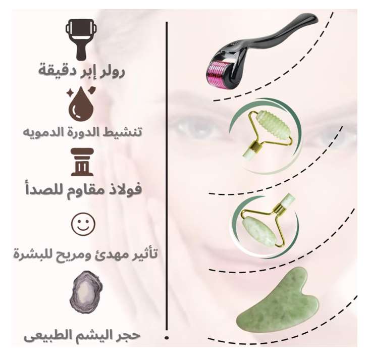 مجموعة بكرات اليشم 3 في 1 – لجمالك الطبيعي ولمسة من الرفاهية دلّلي بشرتك كما تستحق مع مجموعة العناية الفاخرة المكونة من بكرة اليشم، ديرما رولر، وحجر الجوا شا – ثلاث أدوات في مجموعة واحدة تمنحك تجرب
