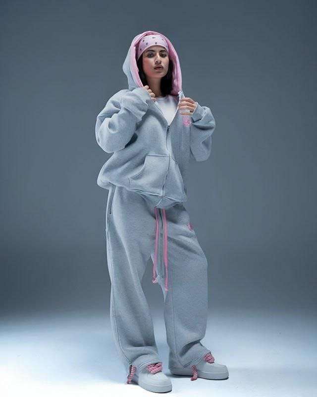 سوت قطعتين بنطلون وايد ليج و سويت شيرت كابيتشوه الماتريال