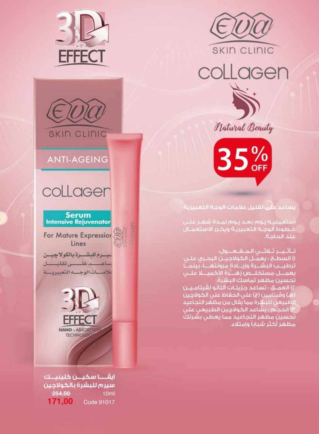 يعمل علي تقليل علامات الوجه التعبيريه والتجاعيد مما يجعل البشره أكثر شباباً يرطب البشره ويزيد مرونتها يستعمل يوم بعد يوم لمدة شهر . ثم عند الحاجه