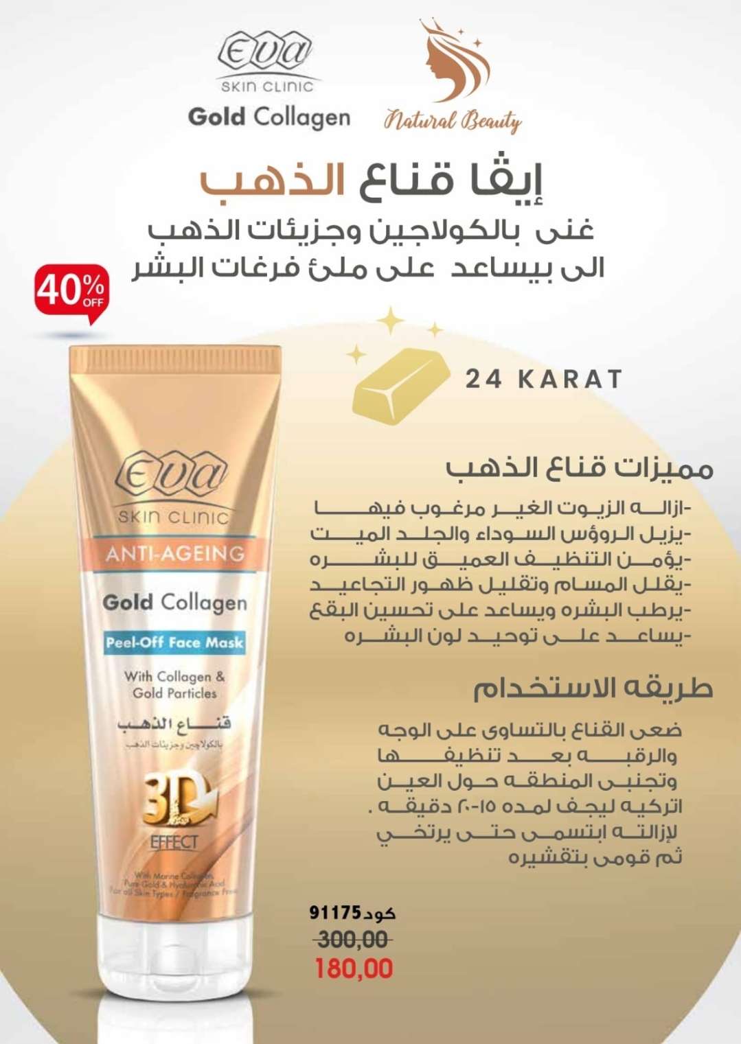 الكولاجين و جزيئات الذهب تساعد علي ملئ الفراغات و إزالة الرؤوس السوداء والجلد الميت يرطب البشره و يقلل ظهور التجاعيد