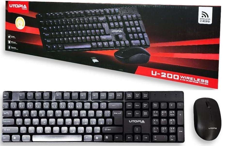 كيبورد + ماوس لاسلكى UTOPIA U-200 بتقنية 2.4 جيجا - مدى 10 أمتار متوافق مع أنظمة ويندوز XP/7/8/10 نظام تشغيل ماك يتم التوصيل عبر مستقبل USB صغير الحجم (مستقبل نانو) دعم ميزة التوصيل والتشغيل السر