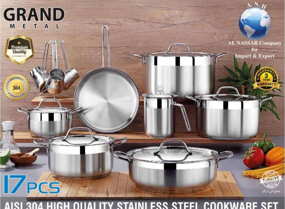 طقم حلة استانلس 18/10 الفا 17 قطعة بالمقاسات المثالية لتلبية كل احتياجات المطبخ المكون من : حله مقاس 18 حله مقاس 22 حله مقاس 26 حله مقاس 32 سوتيز بالغطاء مقاس 28 مقلاه مقاس 26 لبانه مقاس 1.5 ل