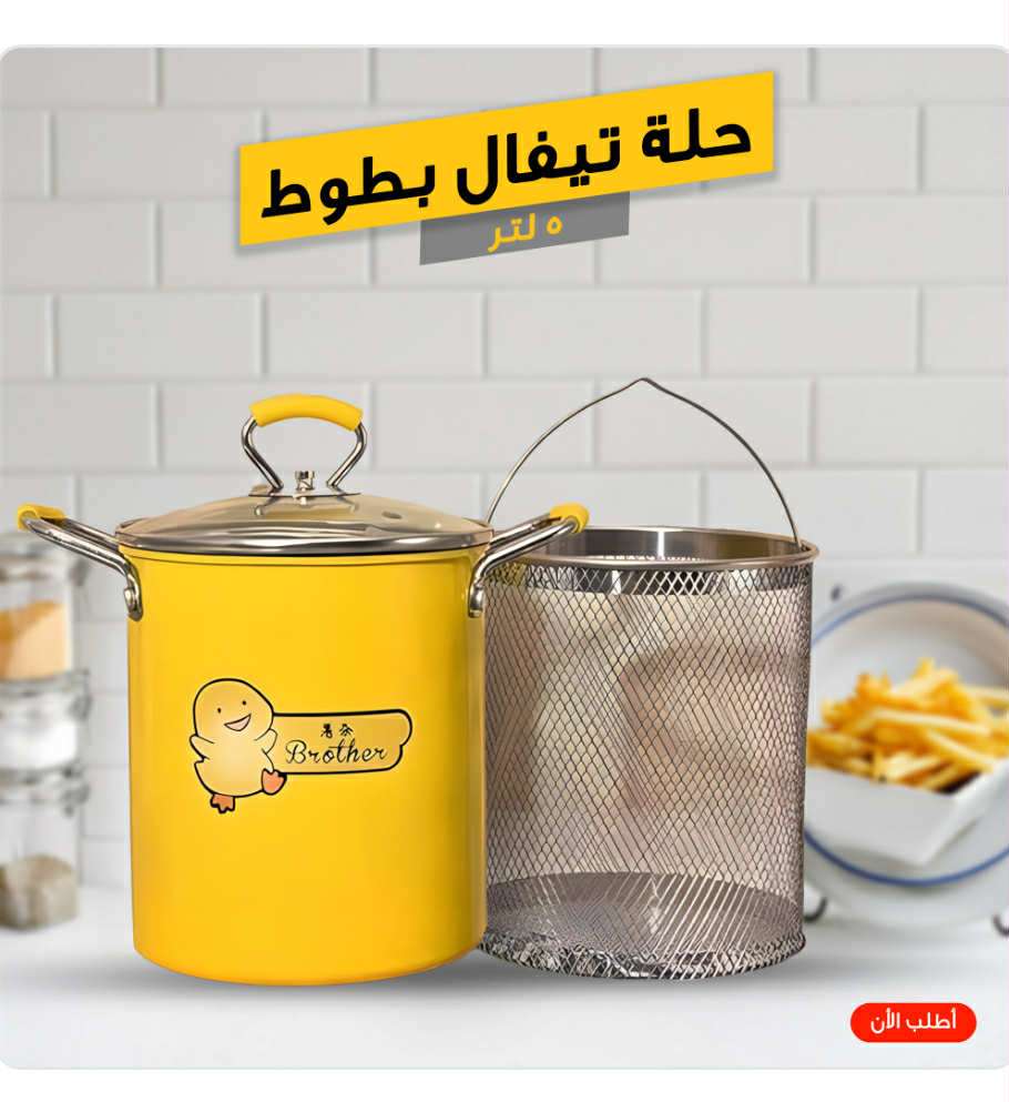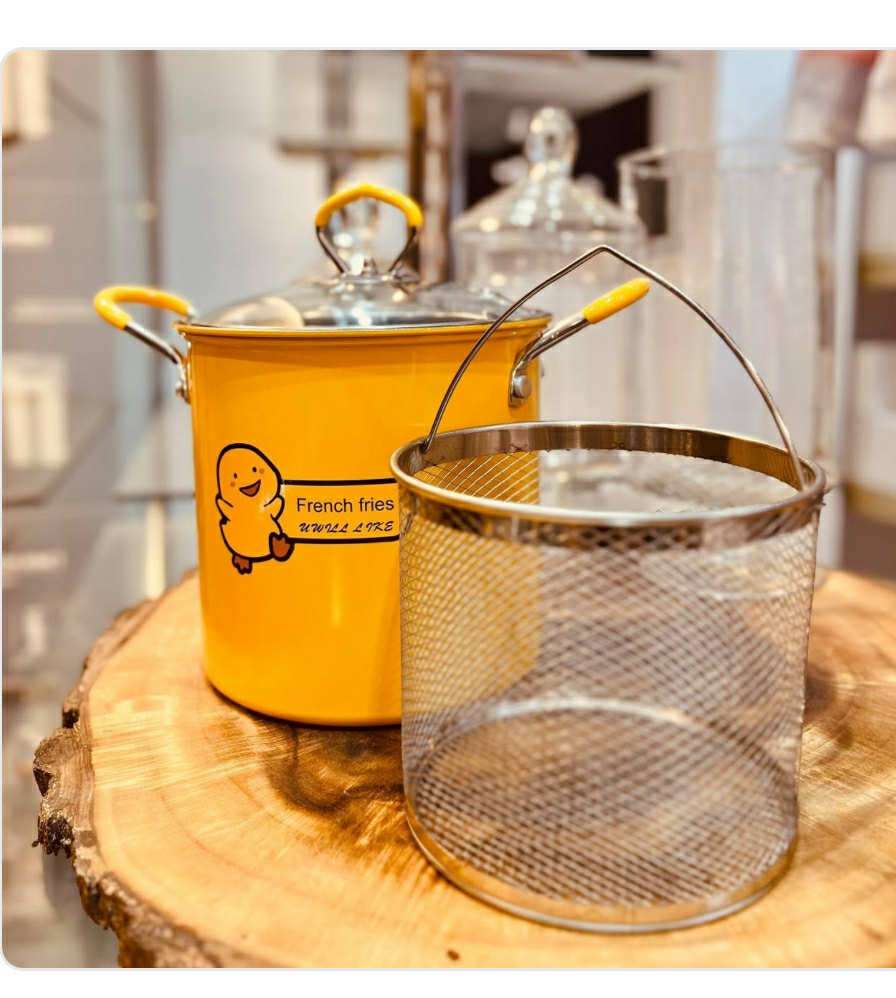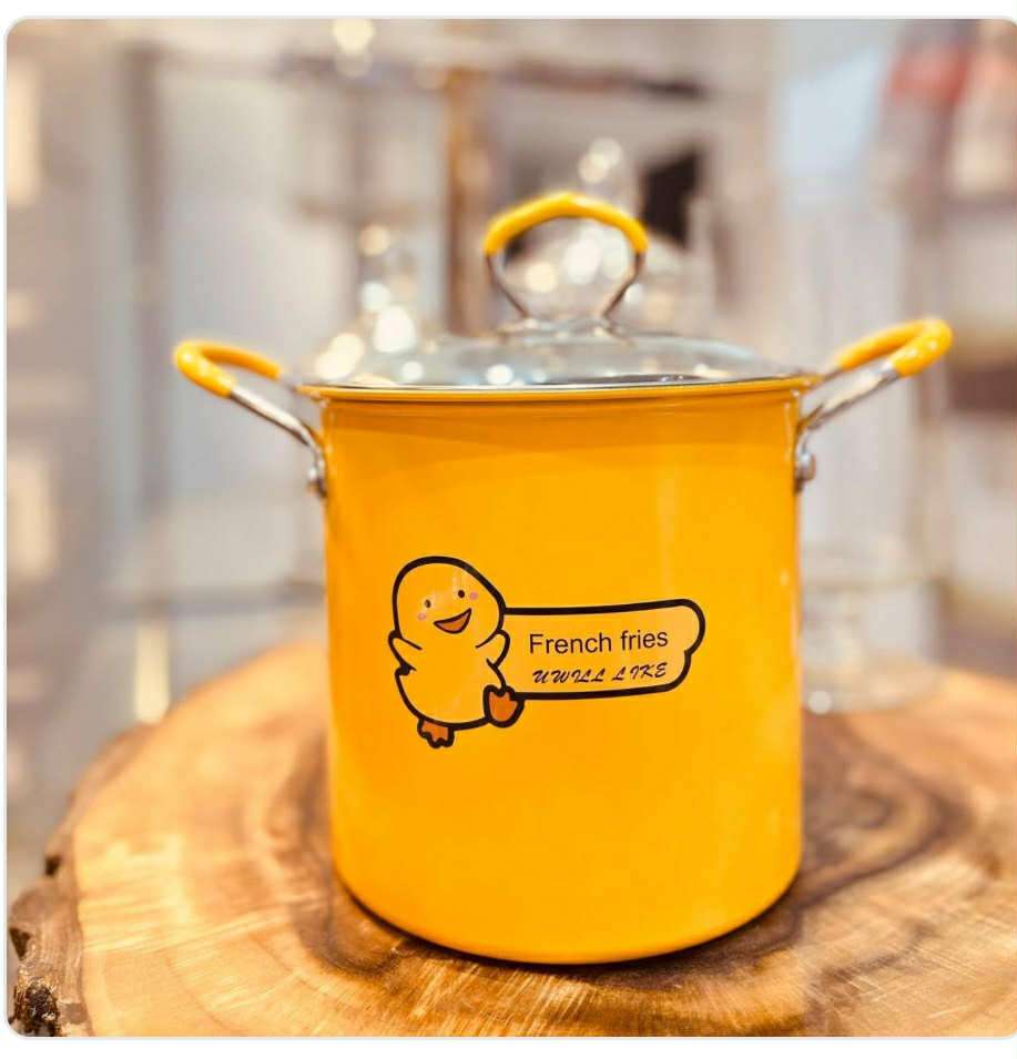 حلة قلى بطوط التريندى بطبقة مانعة للالتصاق بسلة تصفية ستانلس ستيل بغطاء معدنى بفتحات بخار سعة 5 لتر وشكلها الجذاب ترسم البهجة على اطفالك وانتى بتحضرى استخداماتها متعددة فى مطبخك لقلى البطاطس والسمك