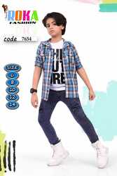 طقم اولادى 3 قطع ،بنطلون جينز رباعية وتيشرت سنجل ليكرا قطن وشميزر بولي٤٥٠ج.م