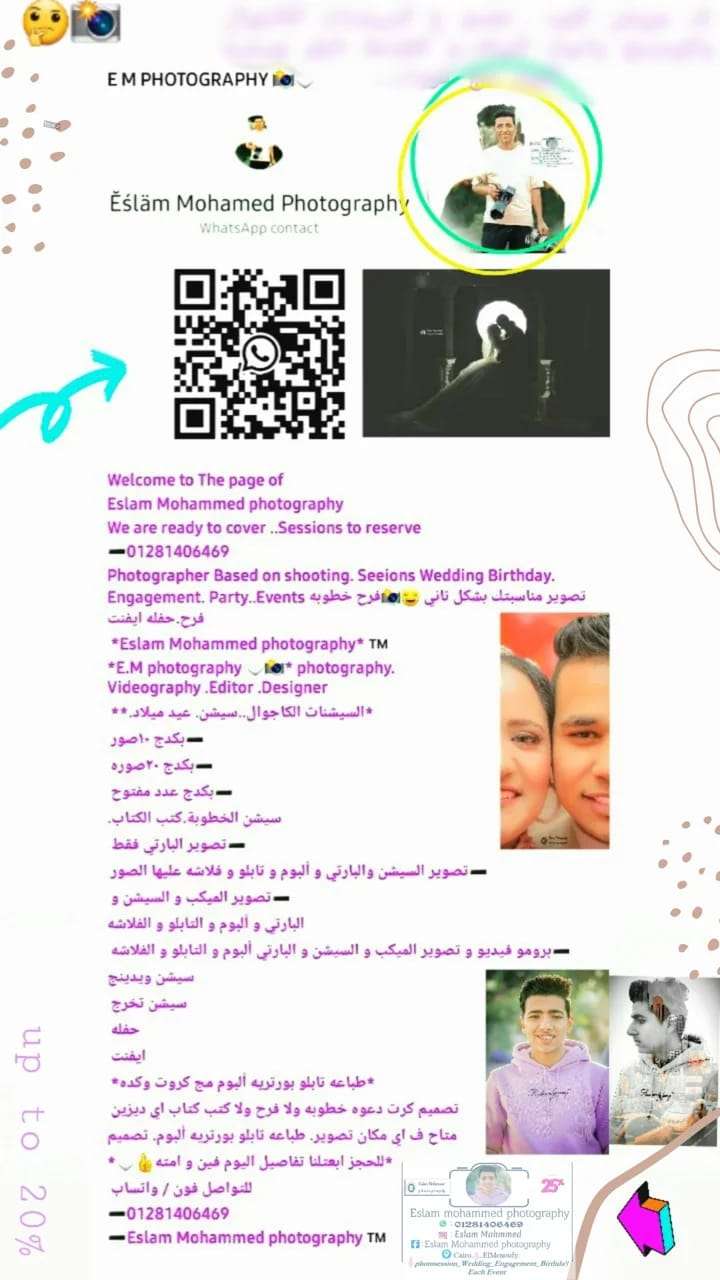 Eslam Mohammed PH تصوير اي مناسبه ومتاح لاي مكان تصوير سيشن فرح خطوبه كتب كتاب عيد ميلاد 📷 بارتي تخرج ايفنت ميكب ريلز طباعه تابلو بورتريه البوم صور مج كروت ديزين دعوه كرت بيزنس ايديت