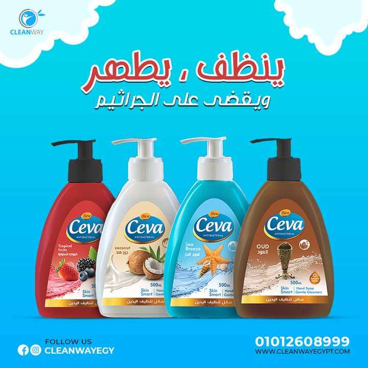 هاند سوب Ceva من إنتاج كلين واى منظف سائل للأيدى ينظف ويطهر ويقضى على الجراثيم ويعطر اليدين 🛒✅✨👌 متوفر بالروائح: " عود - نسيم بحر - جوز هند - فواكه إستوائية "