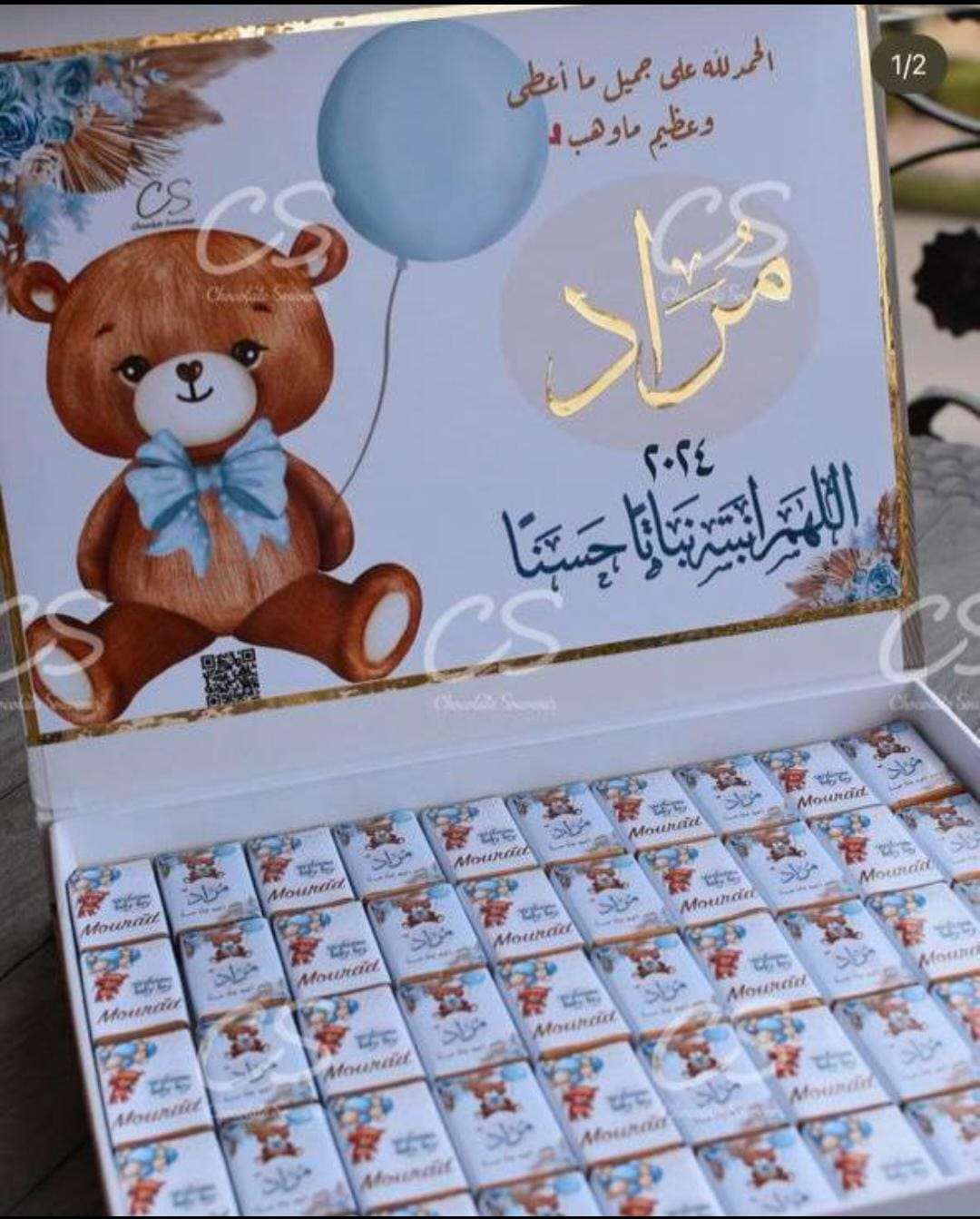 علبه شيكولاته كامله فيها ٧٠ قطعه مطبوع علي كل قطعه اسم البيبي والتاريخ وموجود علب اقل في الحجم واكبر في الحجم https://www.facebook.com/groups/211400489786684/