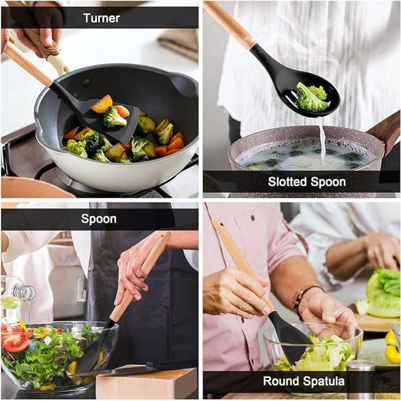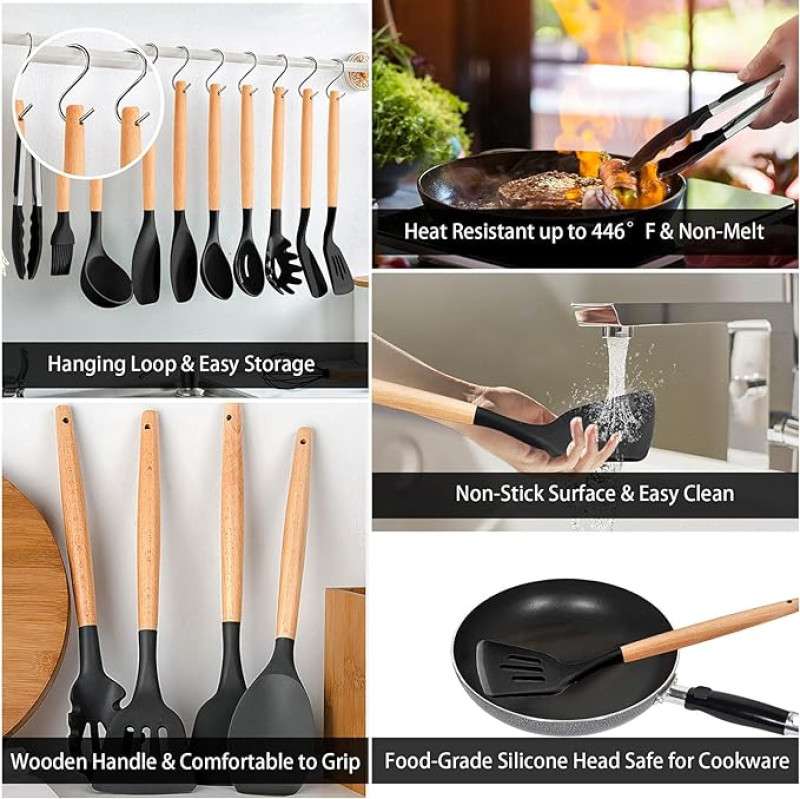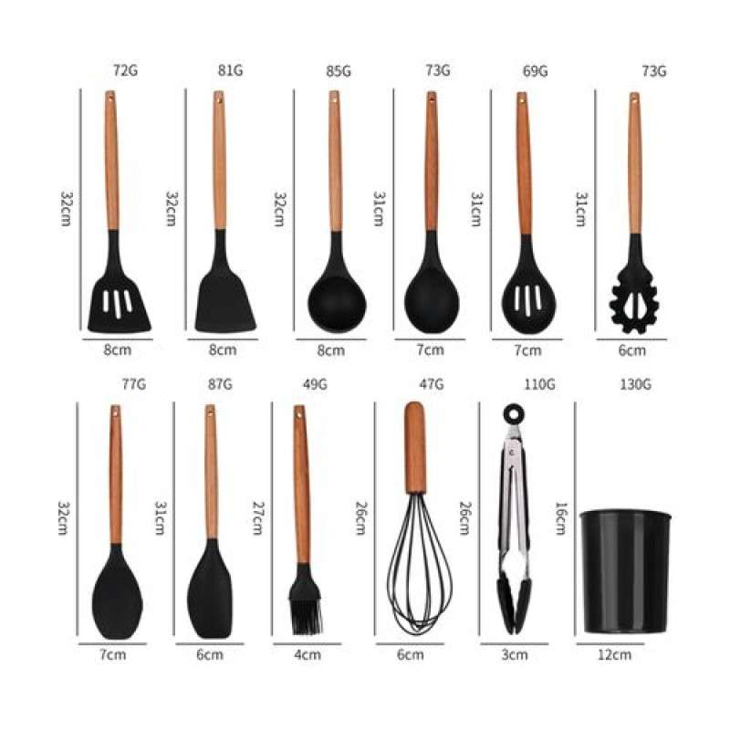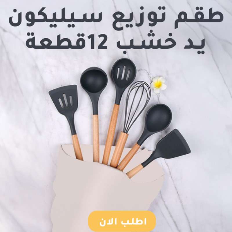 طقم توزيع سيليكون يد خشب 12قطعة وصف : طقم من 12 قطعة - تتضمن معلقة لتقليب الطعام ومعلقة مخرمة لتقليب الطعام وملعقة بفتحات ومغرفة شوربة ومعلقة سباتولا وملعقة لتقديم السباجيتي وملقط ومعلقة سباتولا