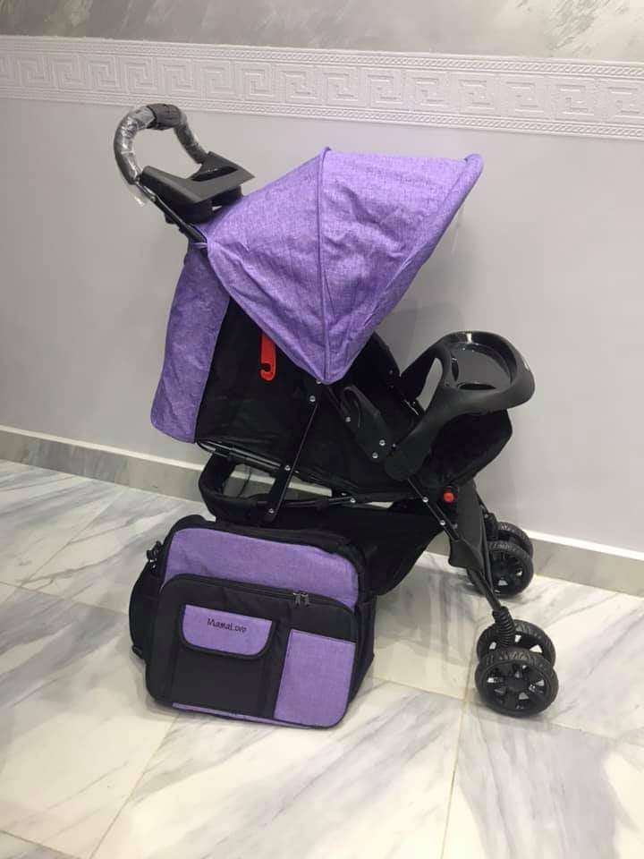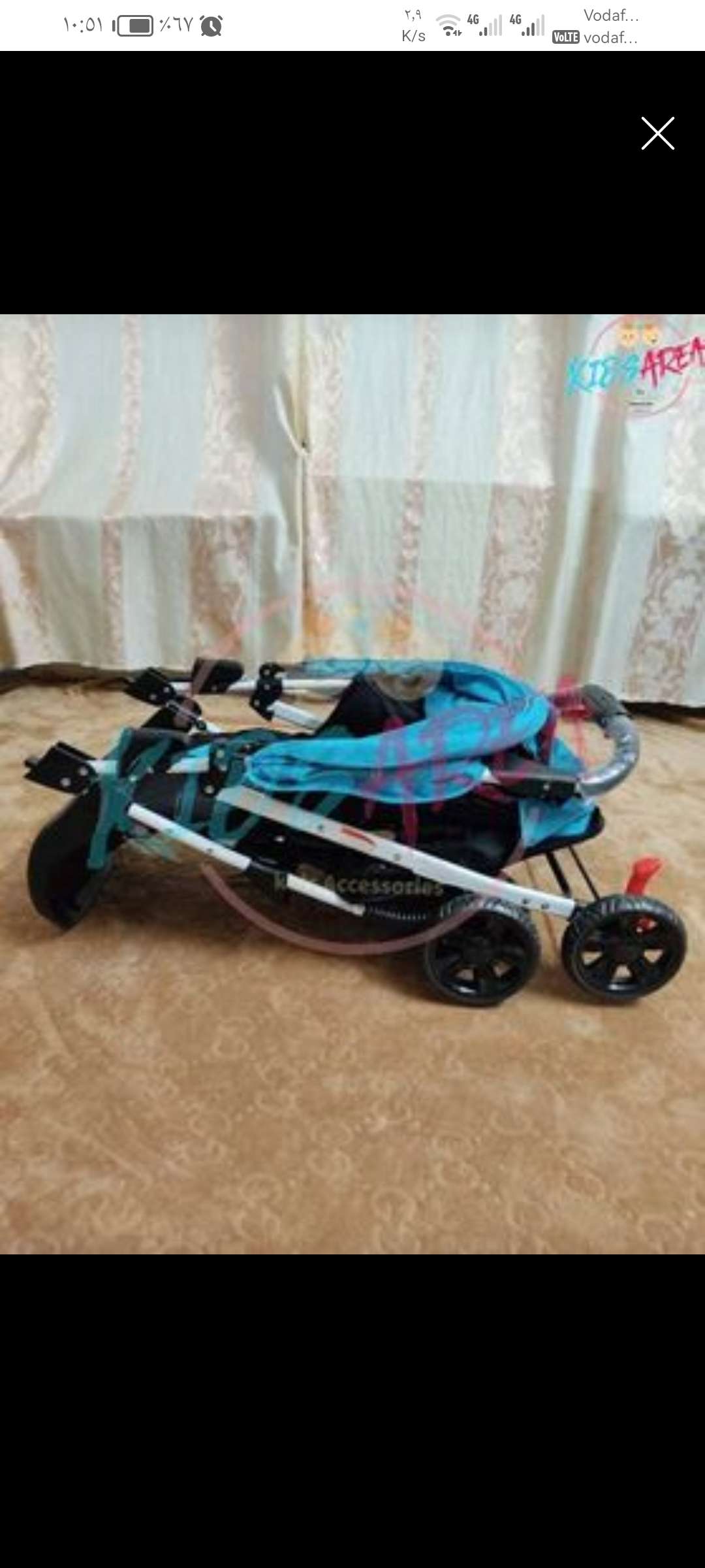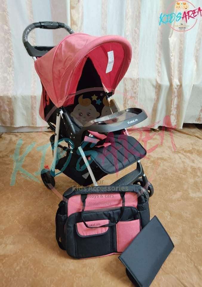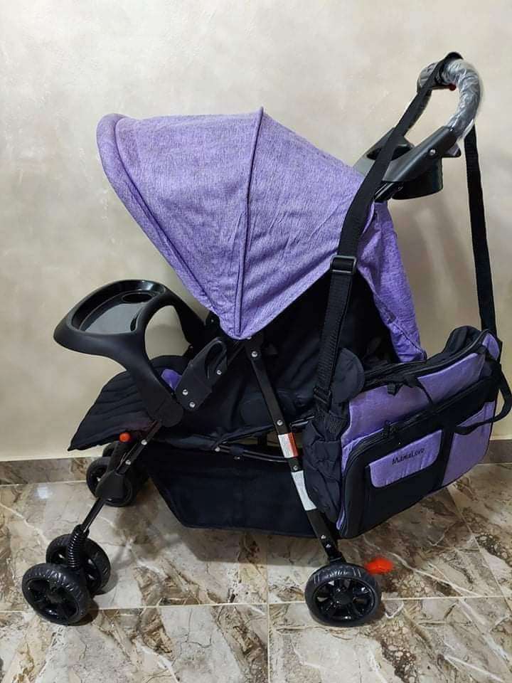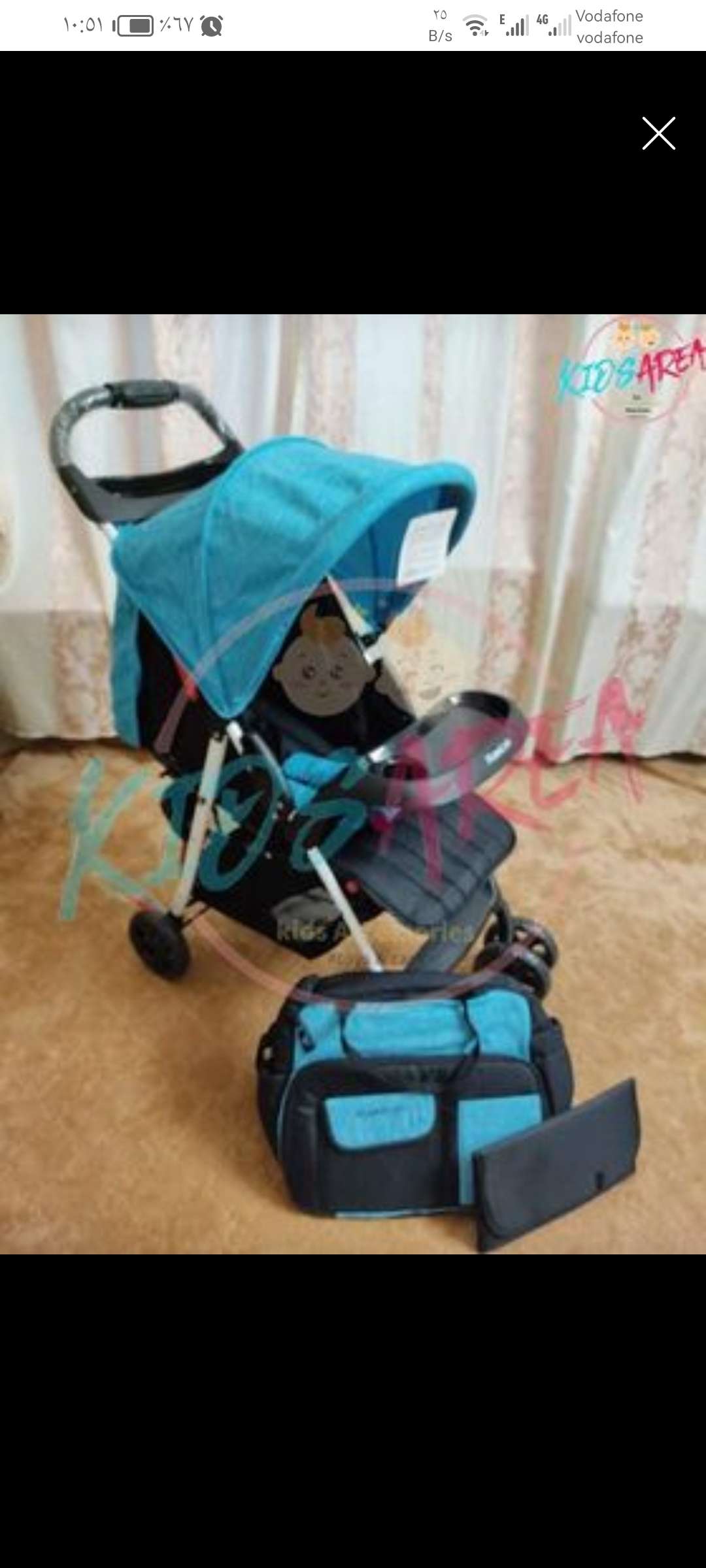 عربية اطفال خفيفة و خفيفة الحركه معاها شنطة من نفس القماش مستويات منها سرير كامل 2 بار بار طعام للطفل و بار للام فرامل خلفية