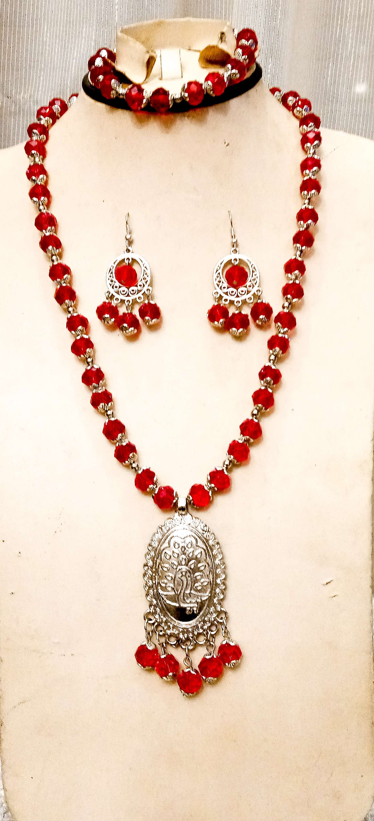 طقم كامل روعة من الكريستال الاحمر ودلاية فضي جميلة روعة واسورة وحلق