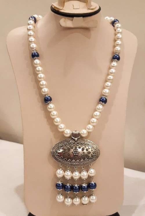 عقد جميل وشيك من اللولى الاوف وايت والأزرق ومزين بدلاية فضي جميلة